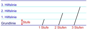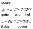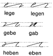 Am Wortende wird «-e» (auch «-ee») durch einen halbstufigen Aufstrich bezeichnet; die nicht betonte Endung «-en» erhält einen kurzen, waagrechten Strich. |